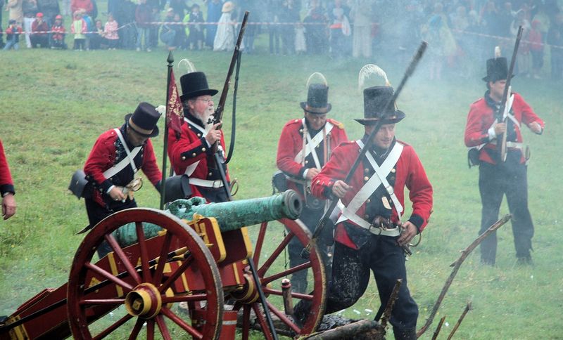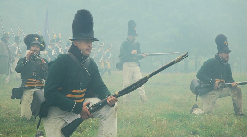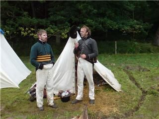 Fler bilder: Wermlands Fältjägare med infanteriet från Österbotten och Uppland Speakern och artikelförfattaren i allmogedräkt, sydd av Johan Palm i WFJ Norsk jägare pustar ut Glatt lägerliv i blöt terräng Tobias Wass som Savolaxare Upplänningar öppnar eld i skogen, Underofficer Hellman ger order